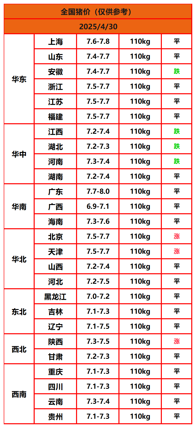 2025年4月30日猪价,今日全国猪价行情走势:3涨19平4跌。