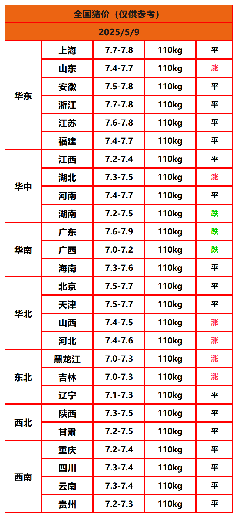 2025年5月9日猪价,今日全国猪价行情走势:7涨16平3跌。