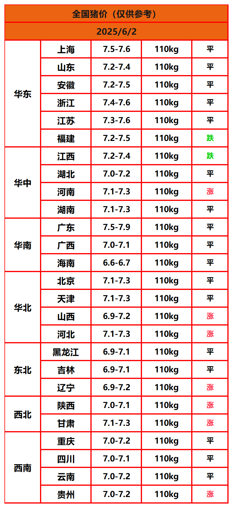 2025年6月2日猪价,今日全国猪价行情走势:7涨17平2跌。